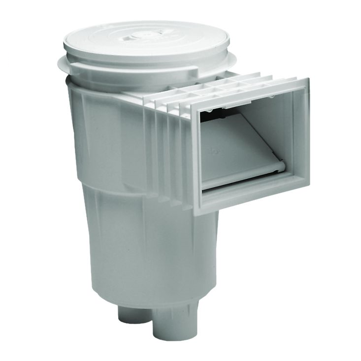 Billenő ajtós szkimmer, fehér ABS műanyagból készült. Alsó szívó csatlakozók: 1 ½” belső, illetve 2” külső. A Szkimmer nem süllyesztett részei UV sugárzásnak ellenálló anyagból készültek. A többletvíz elvezető 32 mm átmérőjű. Tartalmaz szűrőkosarat és vákuumtárcsát. Javasolt áramlás 7 m3/h. Ajánlott 25 m2-es vízfelületenként 1 Szkimmer beszerelése. Állítható tisztító tető magasság, amely segítségével az egy szintbe hozható a burkolat magasságával.